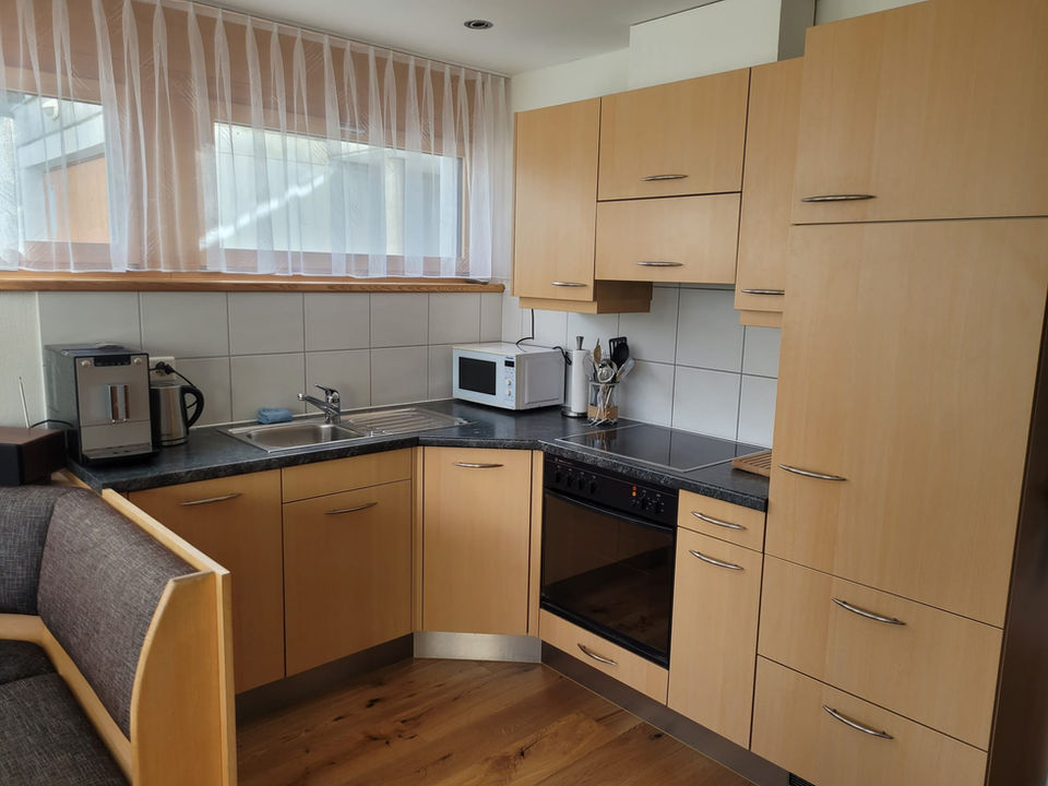 Offene Küche mit Geschirrspüler, Glaskeramikherd und Mikrowelle